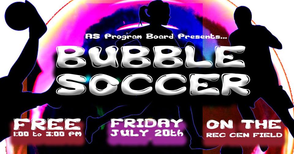 There’s no shortage of fun this summer with A.S. Program Board! FREE bubble soccer tomorrow (Friday, July 20), FREE ice skating (Saturday, July 28), and of course FREE movie screenings every Tuesday at I.V. Theater.