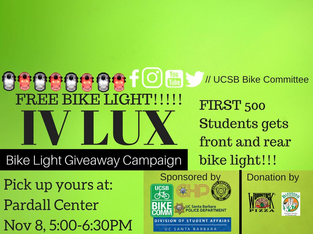 First 500 students to stop by the Pardall Center tomorrow get free bike lights! Wednesday, November 8 at 5 PM – 6:30 PM