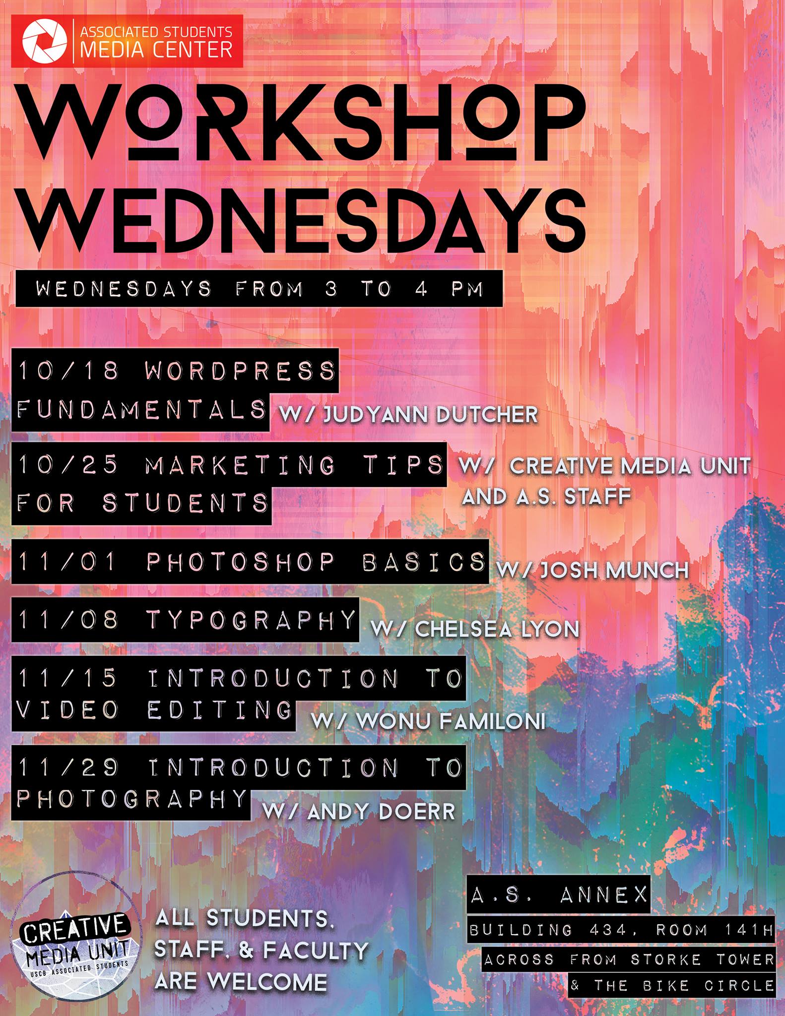 THE WORKSHOP WEDNESDAYS SERIES IS BACK! All workshops meet 3 TO 4 p.m. in the AS Annex, Building 434, Room 141H, right next to the Storke Tower bike circle. Students, staff, and faculty welcome.