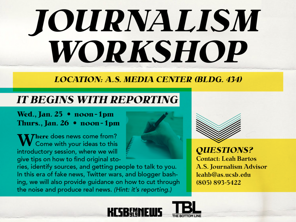 Journalism workshops kick off this week, beginning w/REPORTING. Sessions open to UCSB students with all levels of experience.
