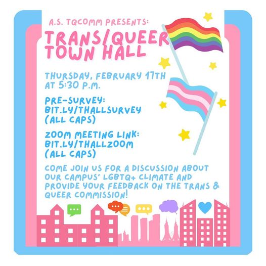 Don’t miss this quarter’s Trans & Queer town hall! It’s next Thursday at 5:30PM
