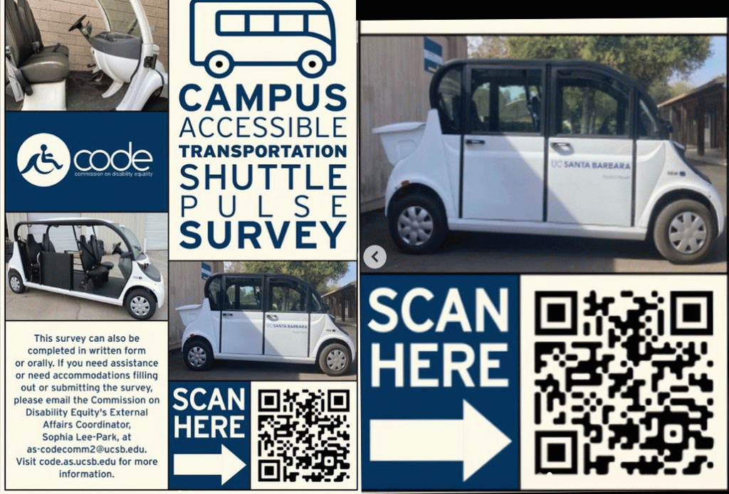 Campus accessible transportation shuttle survey from CODE. This survey can be completed in written form or orally.
